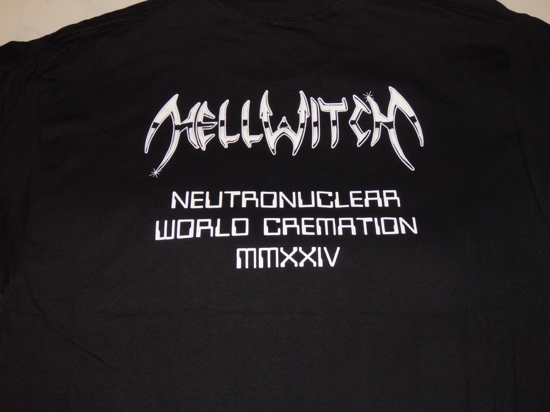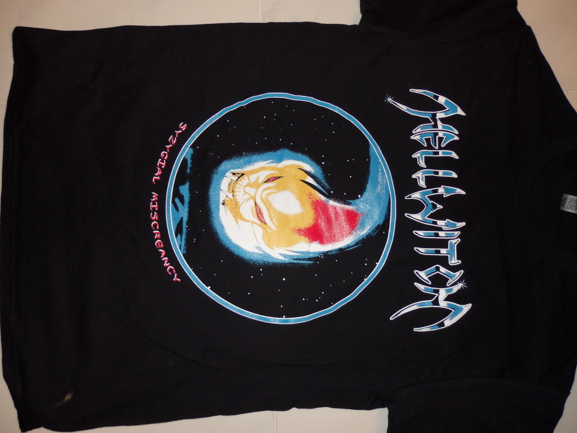 Limited edition 2-Sided "Syzygial Miscreancy" Hellwitch shirt! Featuring classic "comet" cover artwork on front with logo and slogan on back! Printed on high quality Gildan BLACK T-shirts. Comes in men's size S-XL!
